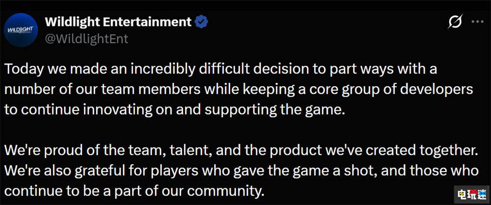 艾历克斯·格拉纳在其领英上发文表示他与Wildlight大部分团队成员今日遭解雇。随后Wildlight官方社交账号也证实裁员,官方表示他们做出极其艰难的决定,与部分团队成员分道扬镳,保留核心开发团队继续推进游戏创新与运营。