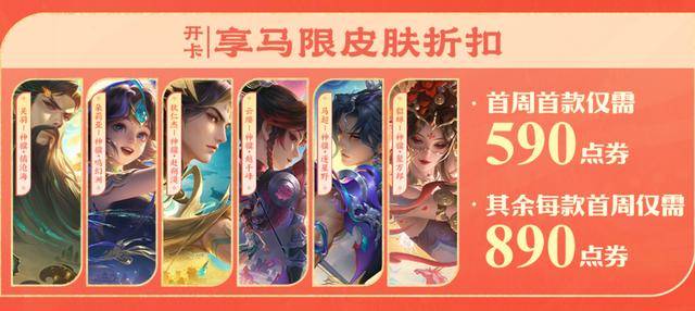 2、新皮肤折中折,马年限定皮肤首周折扣1430点券,开好运卡后首款折扣590点券,其余单款折扣890点券,单款省下840点券。春节期间上线的其他五款新皮肤也有相关折扣,传说皮肤开卡后折扣890点券,史诗皮肤开卡后折扣390点券,单款最低可省320点券。