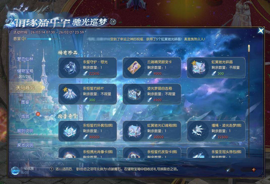 “恋之羽”是本次活动的重要兑换道具,可在“天马商会”换取绝大多数外观。例如30000羽毛可换绑定版的永恒誓约外套包或虹翼驰光幻魂箱,22500羽毛还能换到非绑的“永誓守护·穹光”背饰,方便大家交易流通。不喜欢“抽奖”的玩家完全可以靠攒羽毛直接兑换心仪好礼!
