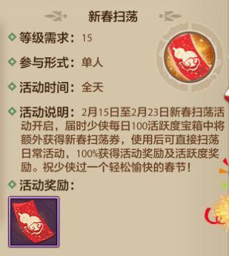 等级大于等于15级的少侠,只要每日攒够100活跃度,就能额外领取新春扫荡券,用券直接扫荡日常,省去手动肝任务的时间,100%拿满活动奖励和活跃度,祝少侠新春喜乐,马到成功,轻松玩转江湖!