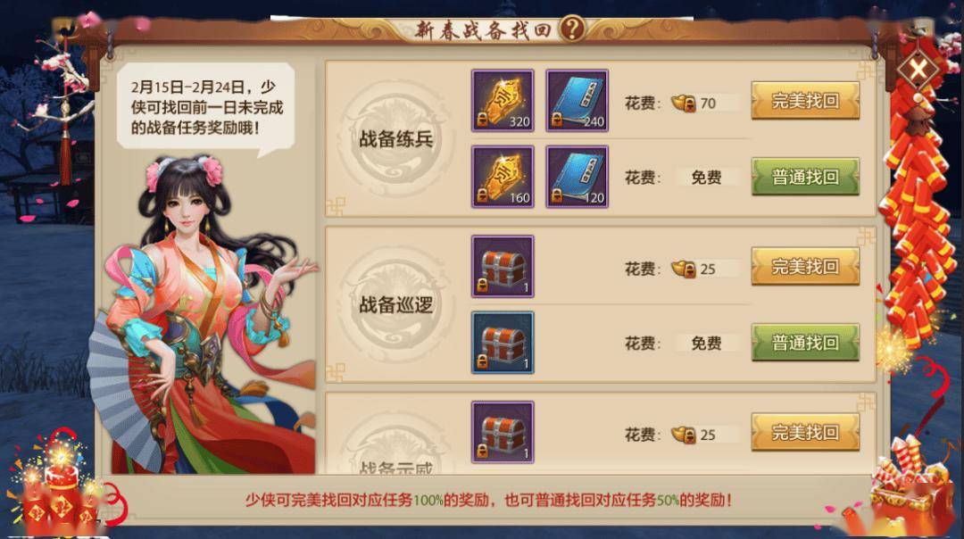 完美找回:消耗少量绑元,即可100%获得全部任务奖励,福利半点不亏!