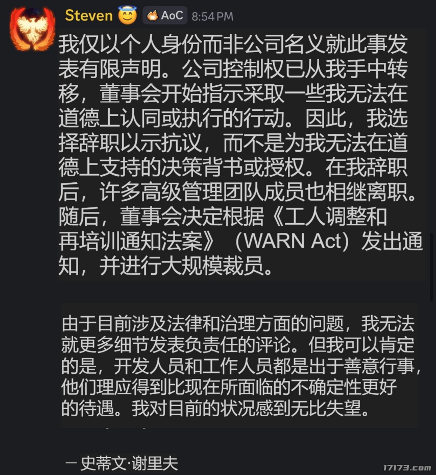 同时,制作人史蒂文也在社区发布声明,称董事会所采取的一系列非道德操作,让他与核心研发团队负气出走,导致项目进入停摆,并引发了大规模的裁员。