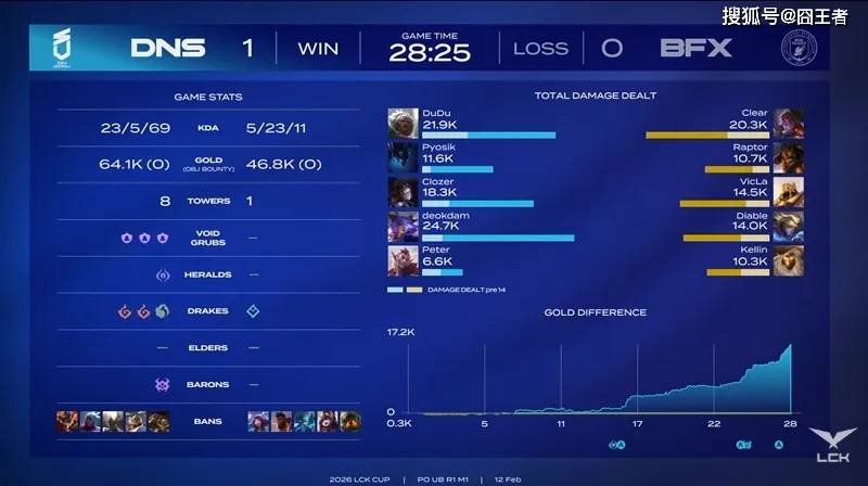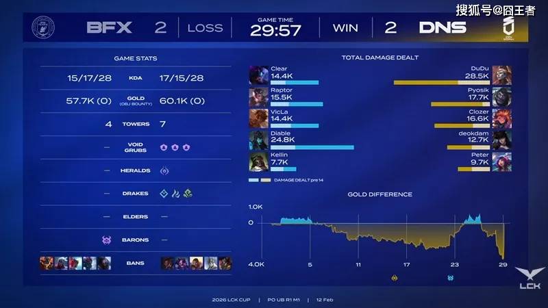 第一局比赛,DNS蓝色方,禁用:鳄鱼,飞机,潘森,韦鲁斯,兰博,选用:DuDu狼母,Pyosik梦魇,Clozer发条,deokdam芸阿娜,Peter洛;BFX红色方,禁用:泰坦,璐璐,格温,奎桑提,妮蔻,选用:Clear阿萝拉,Raptor皇子,VicLa沙皇,DiableEZ,Kellin巴德