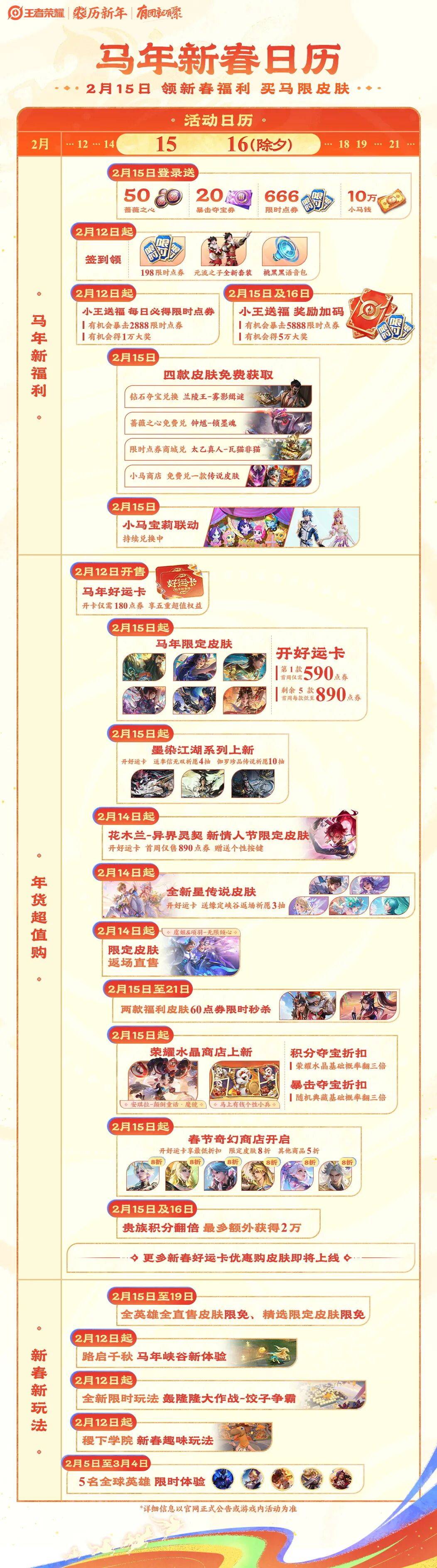 王者荣耀马年新春版本的日历,可以见下图,非常齐全。本次重点,在15号和16号。然后是好运卡的相关皮肤。