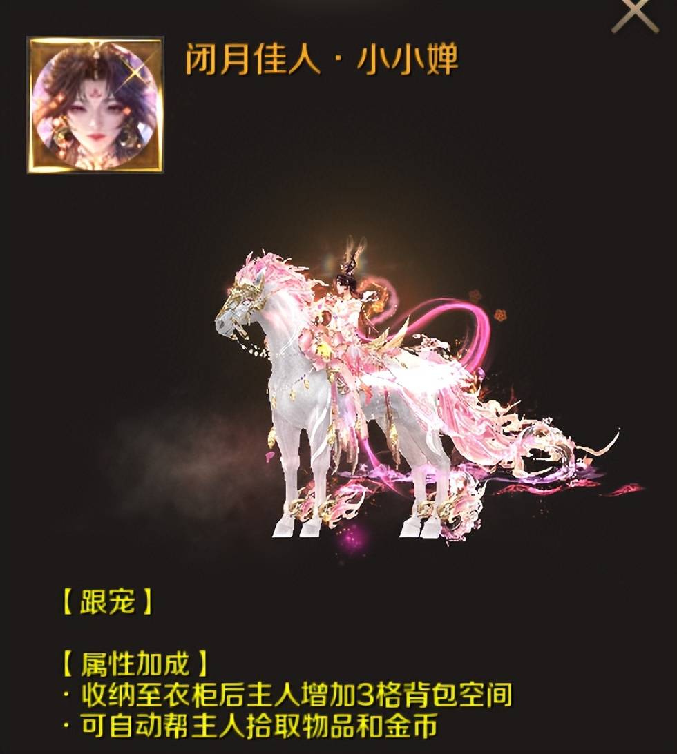 不仅如此,“龙凤策马”也拥有完善的里程碑系统。每参与1次活动,将根据参与次数获得对应数额的“龙马值”。当龙马值累计达到指定数额时,可解锁活动里程碑。这一次的里程碑奖励包含了一只极具收藏价值的跟宠——“闭月佳人·小小婵”。搭配“赤骁舞月”送的是霸气的小小布,两者凑成一对,才算是圆满。此外,里程碑中还包含“闭月溯梦时装箱”,让你在外观上也能焕然一新 。