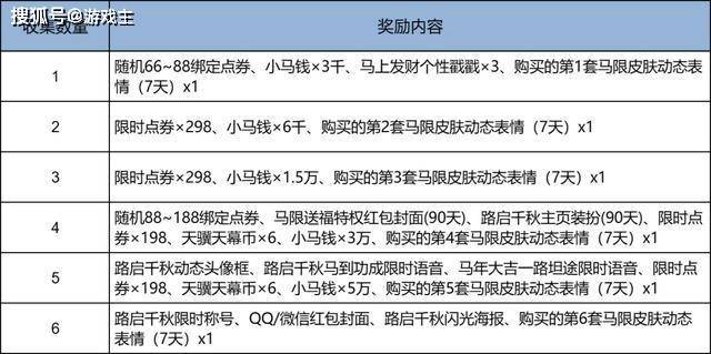 以上是马年限定的收集奖励,包含限时点券,绑定点券和小马钱,收集越多送得越多,集齐6款还有闪光海报和限时称号。