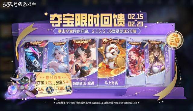 此次不仅普通的积分夺宝有3倍概率,就连暴击夺宝也有,荣耀积分也会进行打折,5连抽是200荣耀积分。