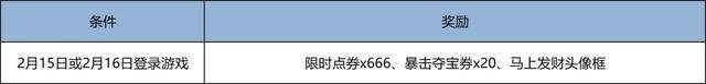 主要的奖励有666限时点券,20张暴击夺宝券和马上发财头像框。