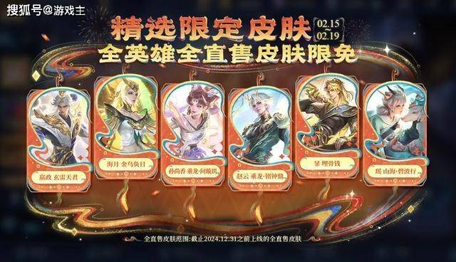 2月15日至2月19日,会再次限免全英雄(包括敖隐和武则天)与全部直售皮肤,还有奇幻商店的6款返场限定,也能在排位赛和巅峰赛里免费用。