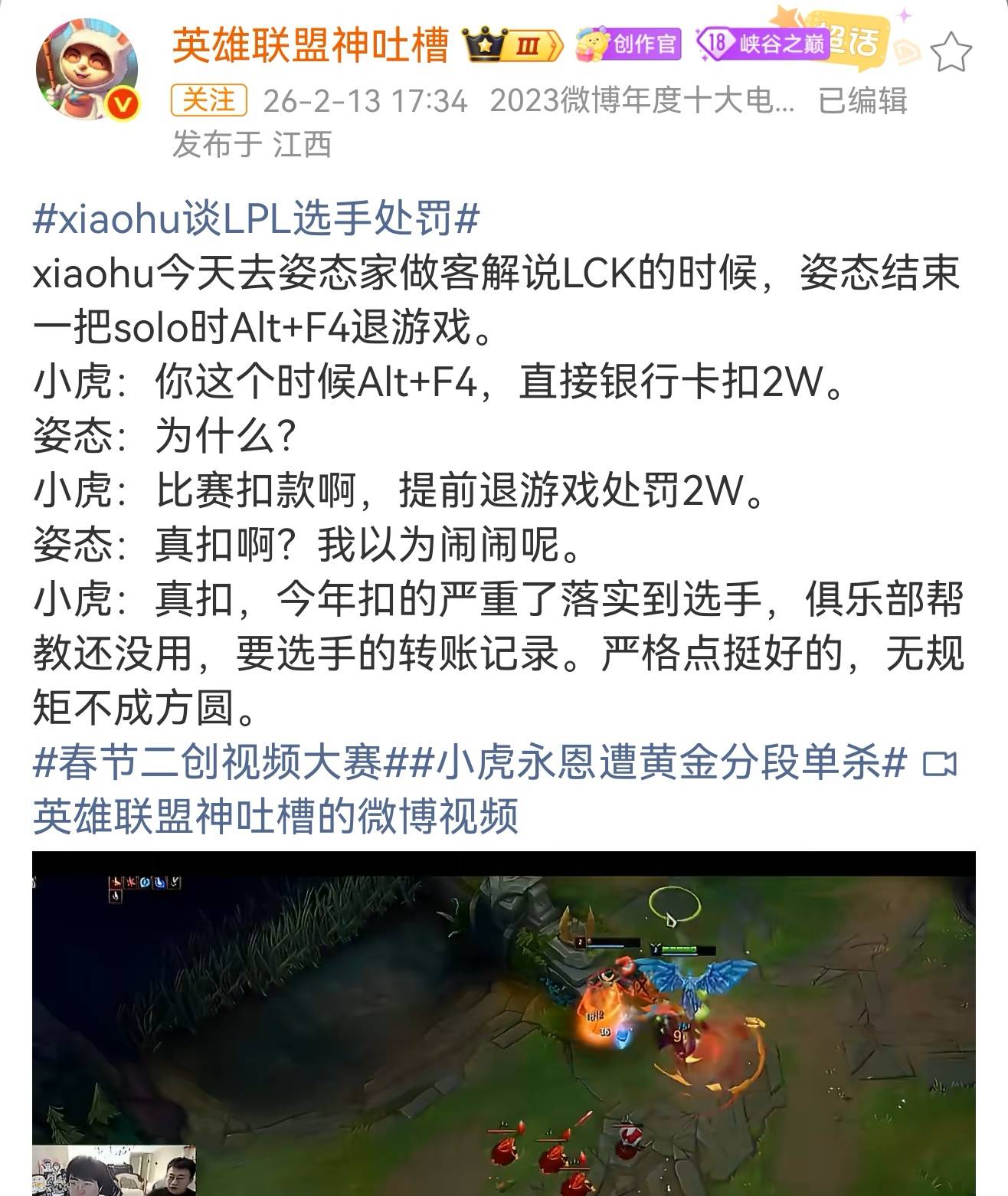 另外,小虎还透露了联盟的新规则,在看到姿态秒退游戏以后,小虎直言,现在LPL新规则管理的可严格了,选手们都不敢造次了了,比如要是选手敢退出游戏,直接扣2万,而且是俱乐部帮忙都没用,必须看到选手的转账记录,很夸张。