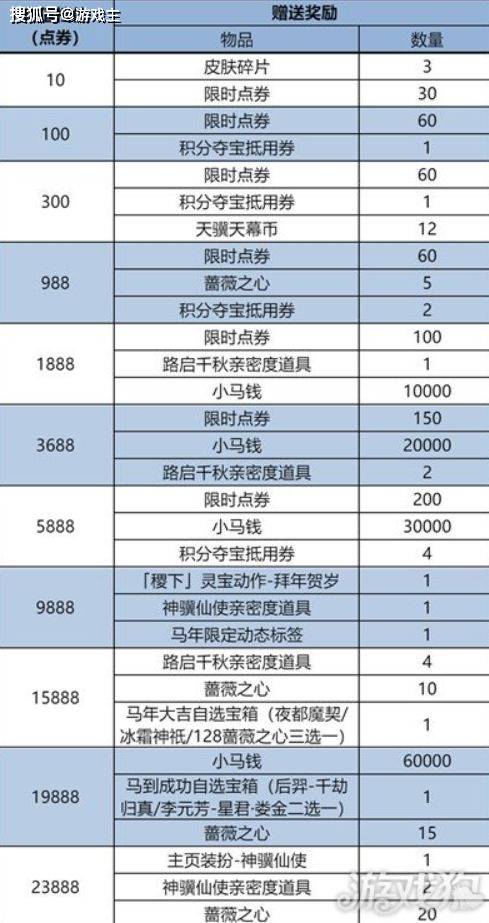 春节累计充值最高档次为23888点券,达到19888时就能获得累计充值的限定皮肤李元芳-星君·娄金、后羿-千劫归真二选一。15888点券就能获得曹操-夜都魔契、盘古-冰霜神祇、蔷薇之心x128三选一。