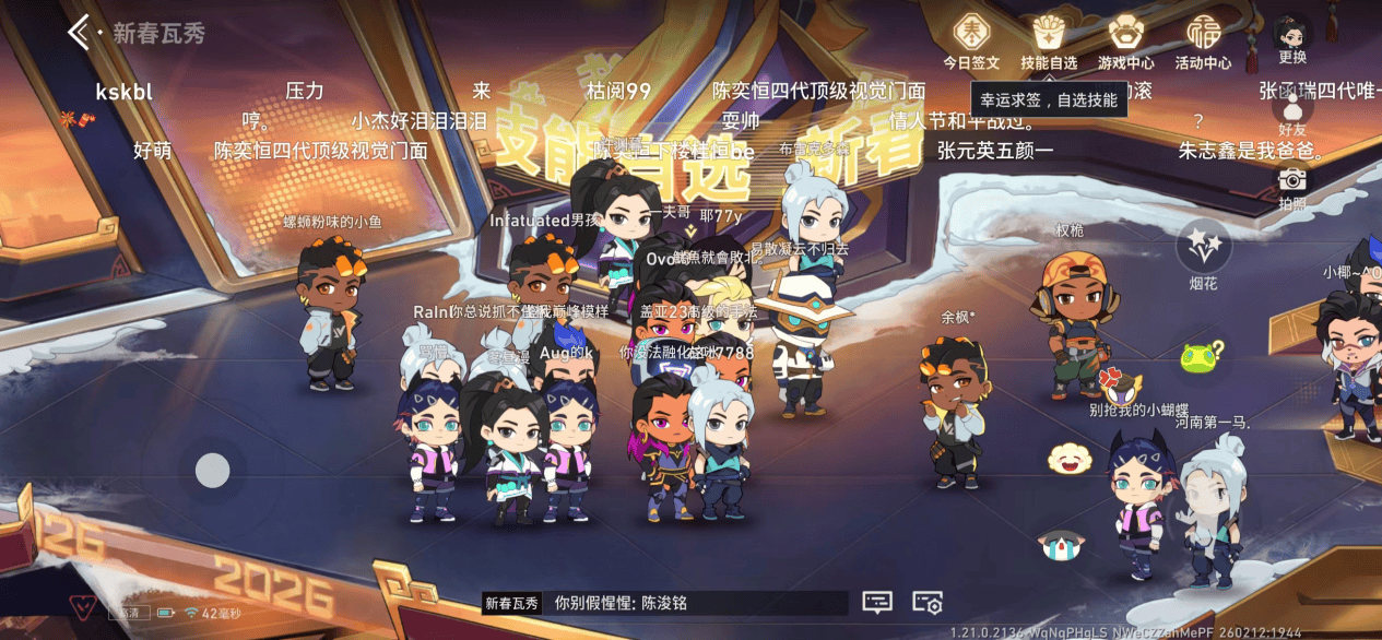 在这个空间里,玩家可以体验"赛博求签",抽取当日运势;可以参与"技能自选",尝试不同英雄的技能组合;可以在新春限定玩法中实战演练。这些设计填补了传统FPS"对局之外无内容"的空白,将等待时间转化为社交时间。当其他游戏的大厅还是冰冷的菜单界面时,瓦手的大厅已经变成了一个有人气、有互动、有仪式感的虚拟空间。