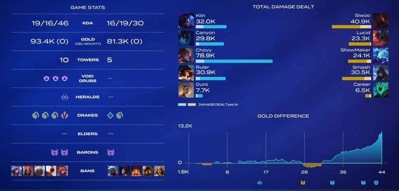 最后一局中路差距比第三局还要更大,彻底沦为Chovy阿萝拉的个人秀,对位完虐冰鸟,ShowMaker狂送不止,本来这局DK打得还不错,一度拿下大龙,但许哥中路养爹太难顶,Chovy波波统治团战最终带走比赛胜利。