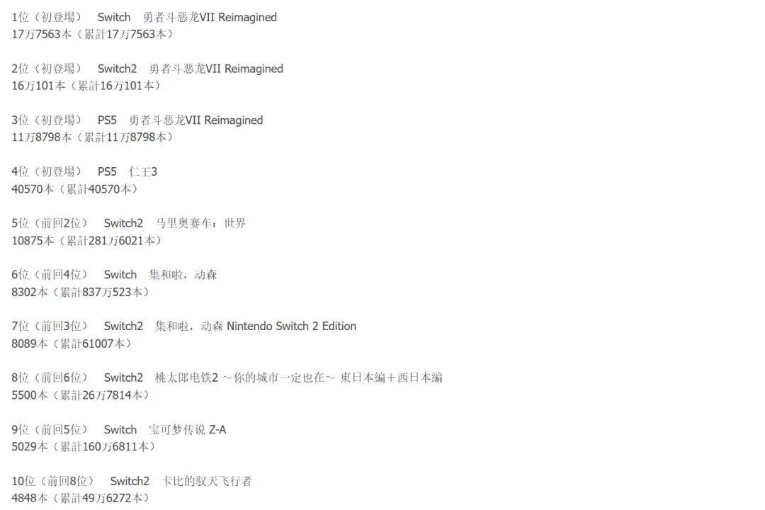 1、《勇者斗恶龙7重制版》霸占前三,PS5新作上榜
