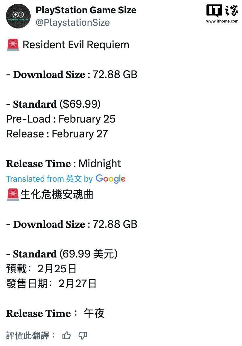 IT之家 2 月 15 日消息,消息人士 PlayStation Game Size 昨天在 X 平台发文,曝光卡普空《生化危机:安魂曲》游戏 PS5 版的文件大小。