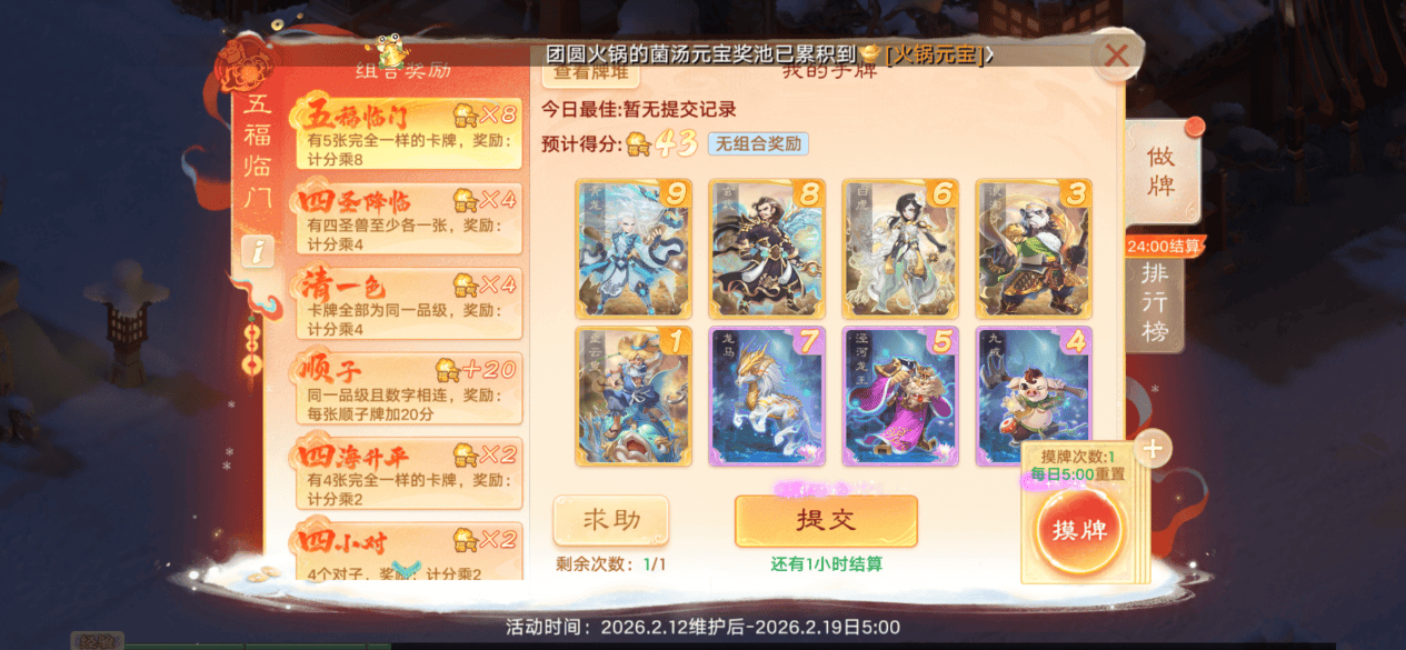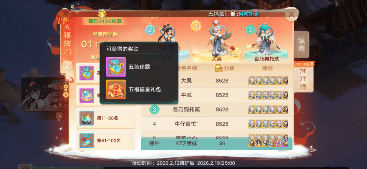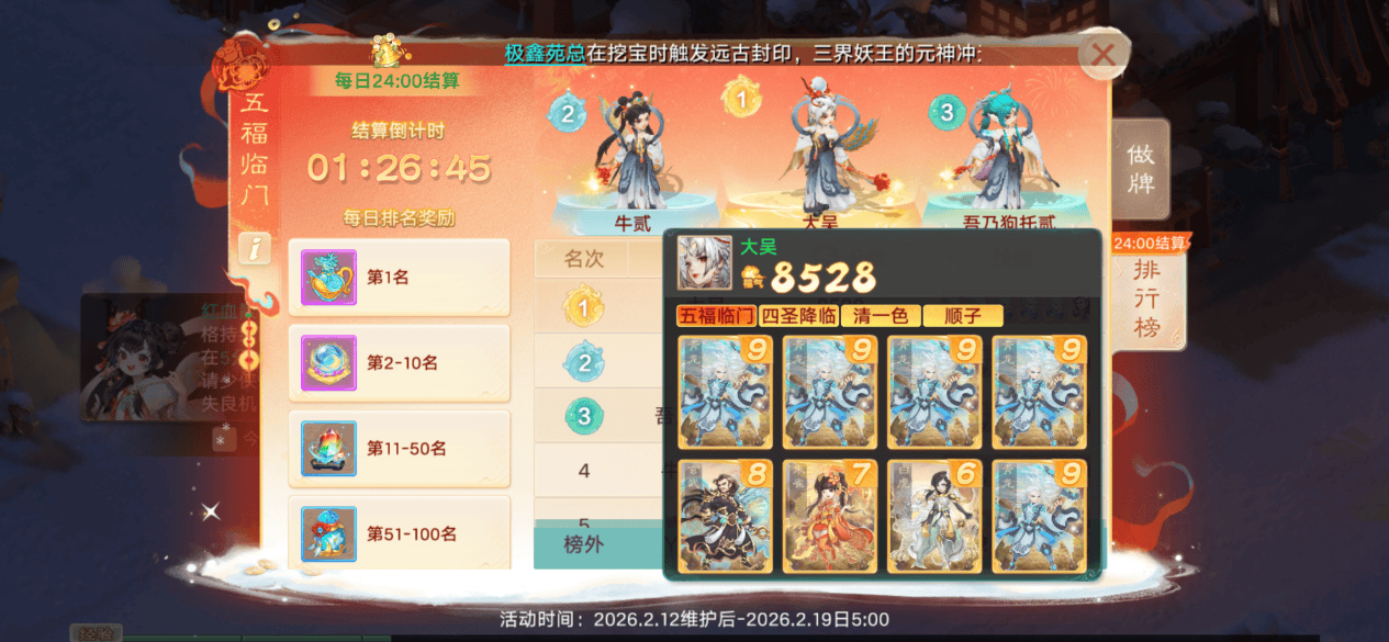 第一名这套卡牌就是凑够了五福临门、四圣降临、清一色、顺子,积分直接翻倍,达到了8528分高居榜一。第一名奖励五色珍露和五福福星礼包,有机会几率哦,建议大家都尽量争取一下排名靠前。