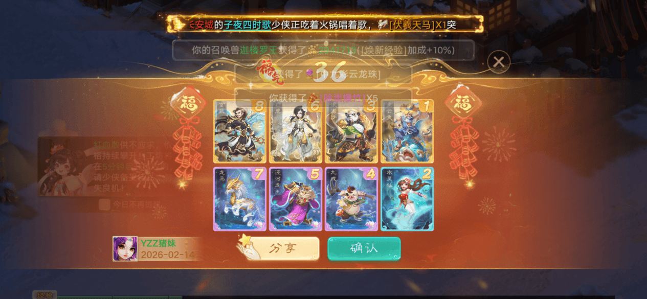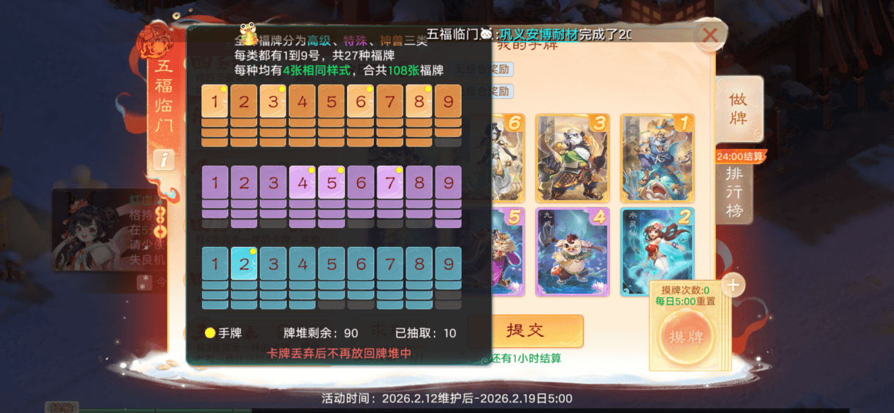 游戏规则很简单,每天有10次摸牌机会,摸完之后可以选择丢弃或替换手牌,初始卡牌库共有108张,抽卡为不放回抽取。每天做日常活跃、参与八骏争春玩法、打卡春节景观都可以获得抽卡次数。
