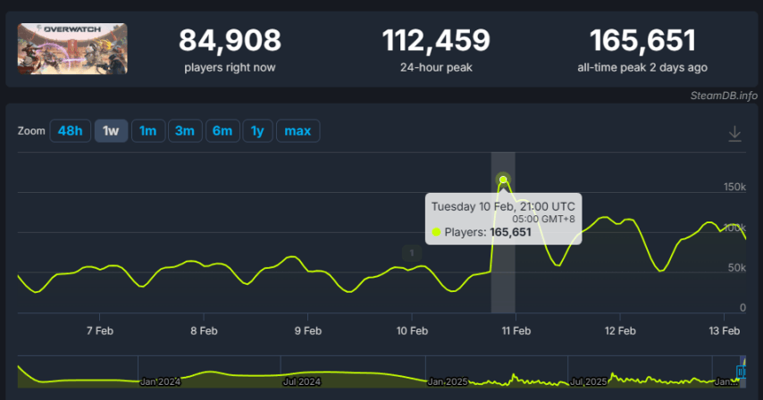 随着这次大更新,《守望先锋》也一转颓势,人气迎来一波暴涨,Steam玩家数量来到了16w以上。