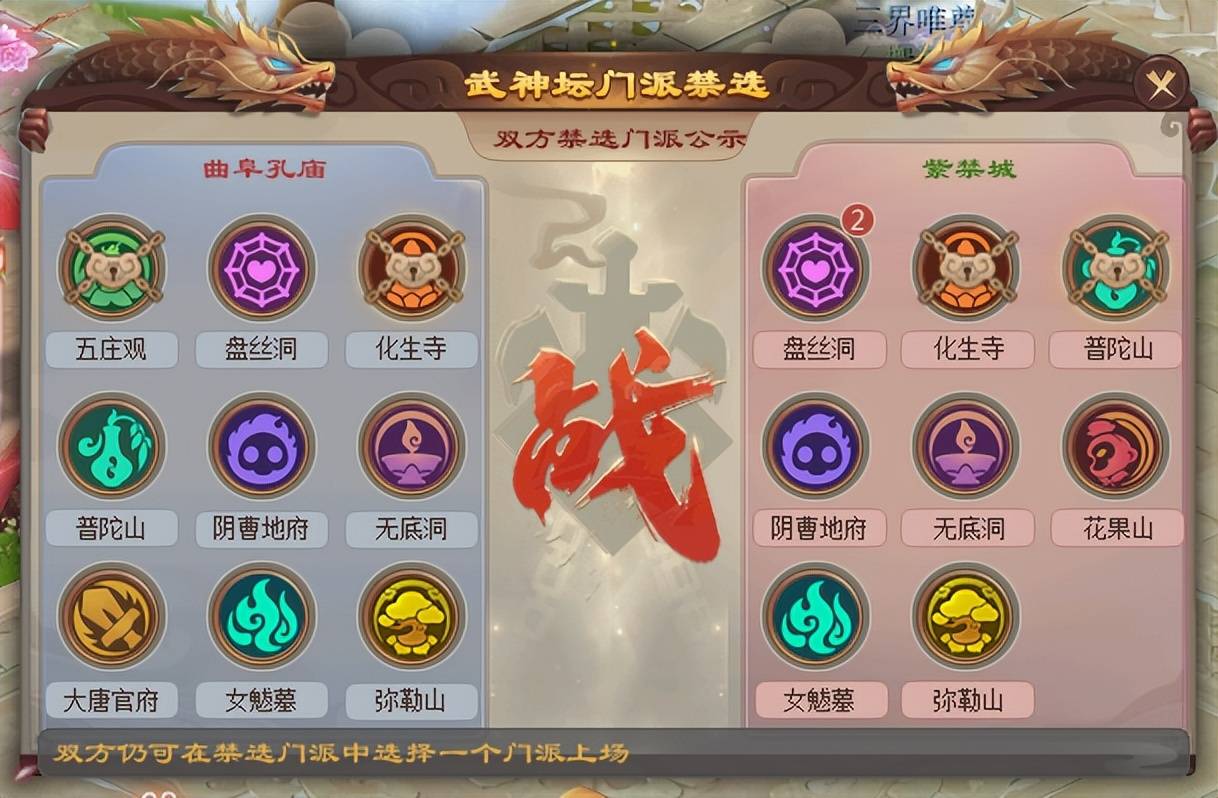在禁选环节中,紫禁城为迫使曲阜孔庙放弃多封系阵容,选择禁用化生寺与五庄观;而曲阜孔庙思路明确,为限制对手使用四保一阵容,则禁掉了紫禁城的普陀山和化生寺。最终,紫禁城复活了普陀山,曲阜孔庙则复活了化生寺。