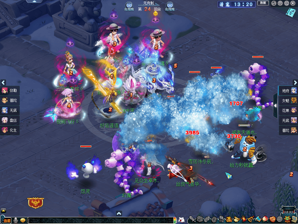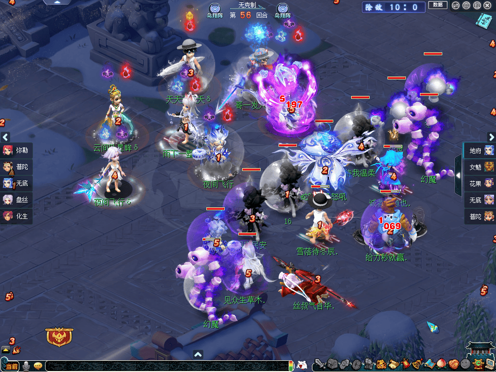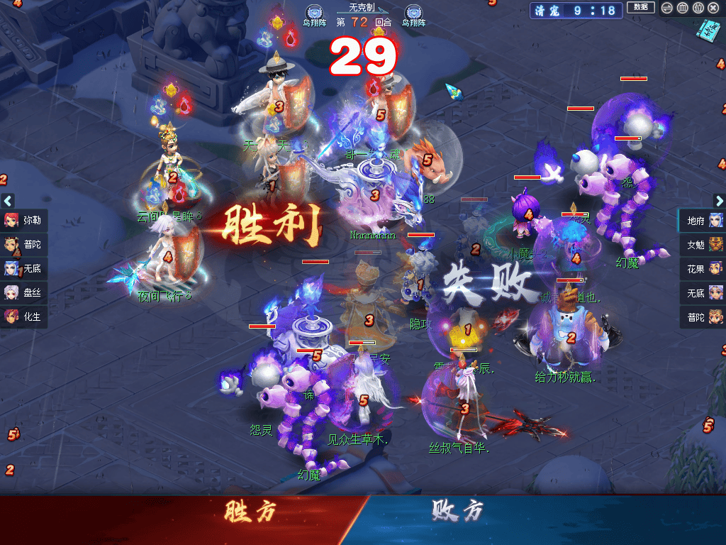 就阵容而言,紫禁城秉持“进攻才是最好的防守”的理念,摆出以“女魃、花果、咒师普陀”为核心的三攻体系,力求一波发力、速战速决;而曲阜孔庙则以稳为主,引入新门派弥勒山,构筑了一套抗性拉满的“四保一”阵容。进入战斗后,双方均选择鸟翔阵,无阵法克制关系。