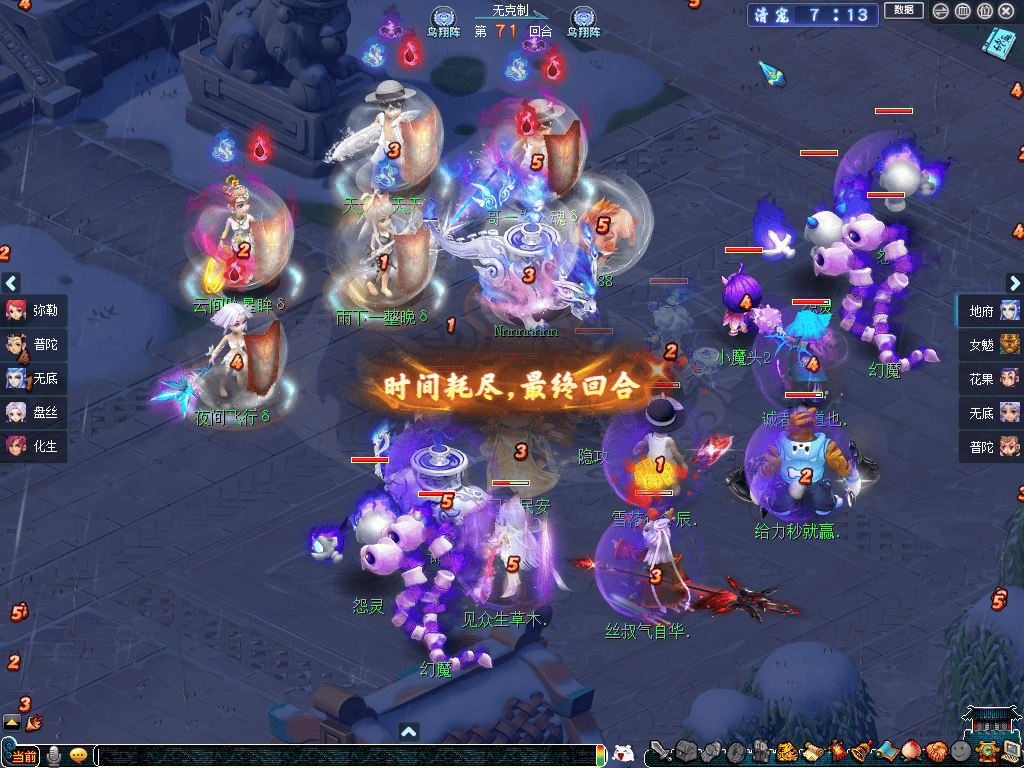 战局一直拖入决胜回合。此时,紫禁城花果山虽血条见底且身中紧箍咒,处于劣势,但好在有龟速宠及时拉起。