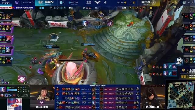今天的BO5看下来GEN可以说是全方位碾压了BFX,上路Kiin、中路Chovy轮流打出亮眼表现Carry比赛,Canyon在打野对位上也是占据上风。GEN再次证明他们在联赛内的王座难以被撼动,而这场比赛的胜利不仅意味着他们率先锁定LCK杯总决赛的门票,同时他们也将成为全球第一支锁定全球先锋赛名额的战队。