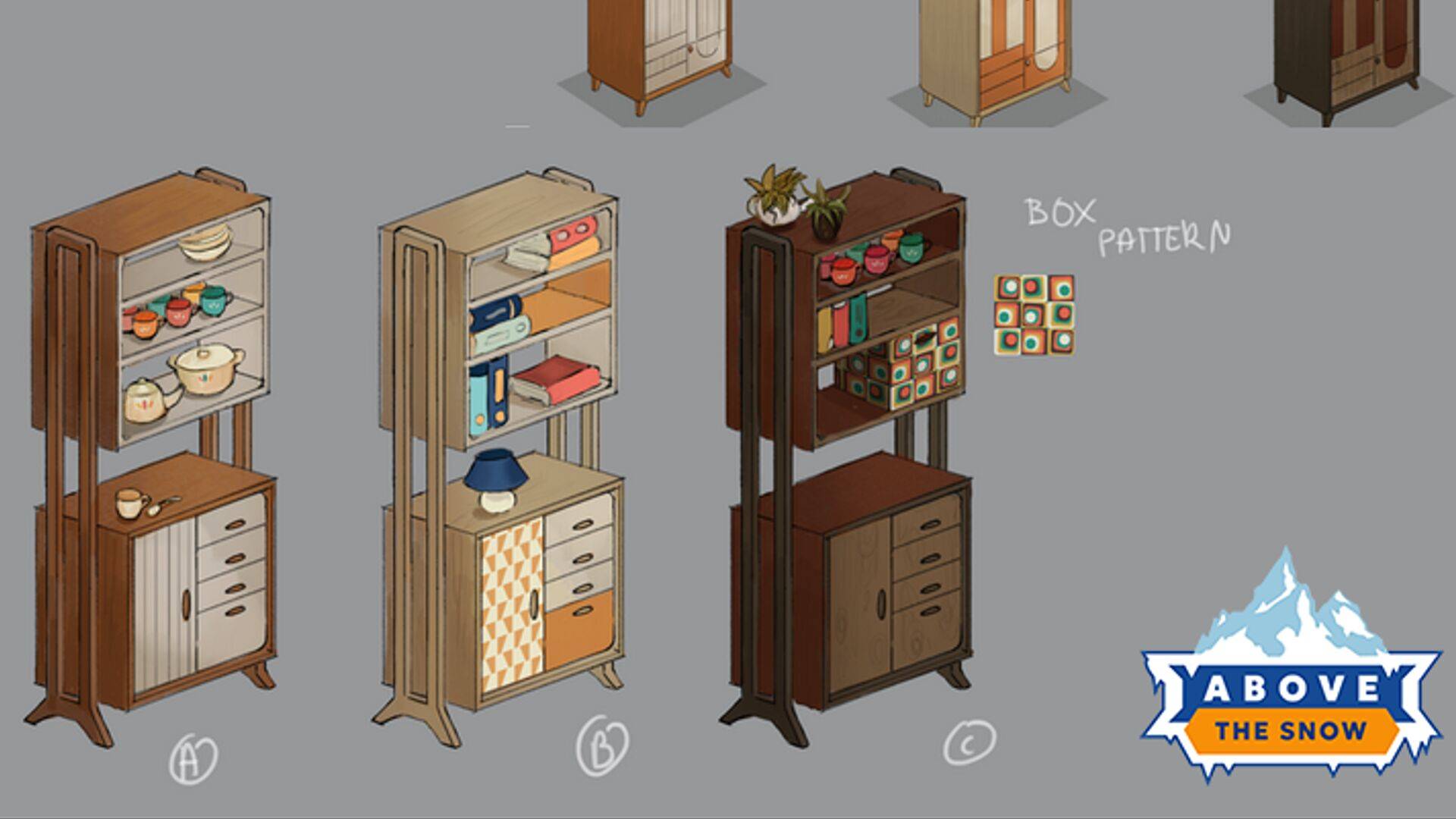 即使30天的雪崩倒计时迫在眉睫,作为经营者的我们仍拒绝向绝望妥协。在《覆雪之上》中,珍惜生命的方式就是将生活升华为艺术。游戏深度联动了Fjord Fiesta、Heywood-Wakefield等经典家具品牌,在严谨还原1960年代设计美学的基础上,为每一件家具打造了极具细节的定制化外观,不仅包括木头的颜色纹样,还涉及到家具内部物品的种类与放置方式。以橱柜为例,游戏设计了放置着陶瓷厨具的碗柜,摆放着书籍和台灯的书架,还有摆放着绿色植物的杂物柜。这种细节上的美学考究,是开发团队不仅认真思考了家具们的使用场景,还努力为游戏中的角色生活注入了热爱生活的艺术。