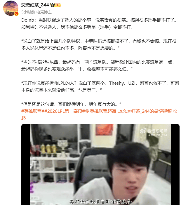 Doinb谈到LPL热度下滑严重的时候,说话也很直接。Doinb:现在你说真能拯救LPL的人?说白了就两个,Theshy、UZI,哥哥也救不了,哥哥本身的流量本来就没他们高,他是第三。当时联盟定了选人的那个事,说实话真的很蠢。搞得很多选手都不打了。如果当时不做选人,我不信那么多明星选手全都不打。