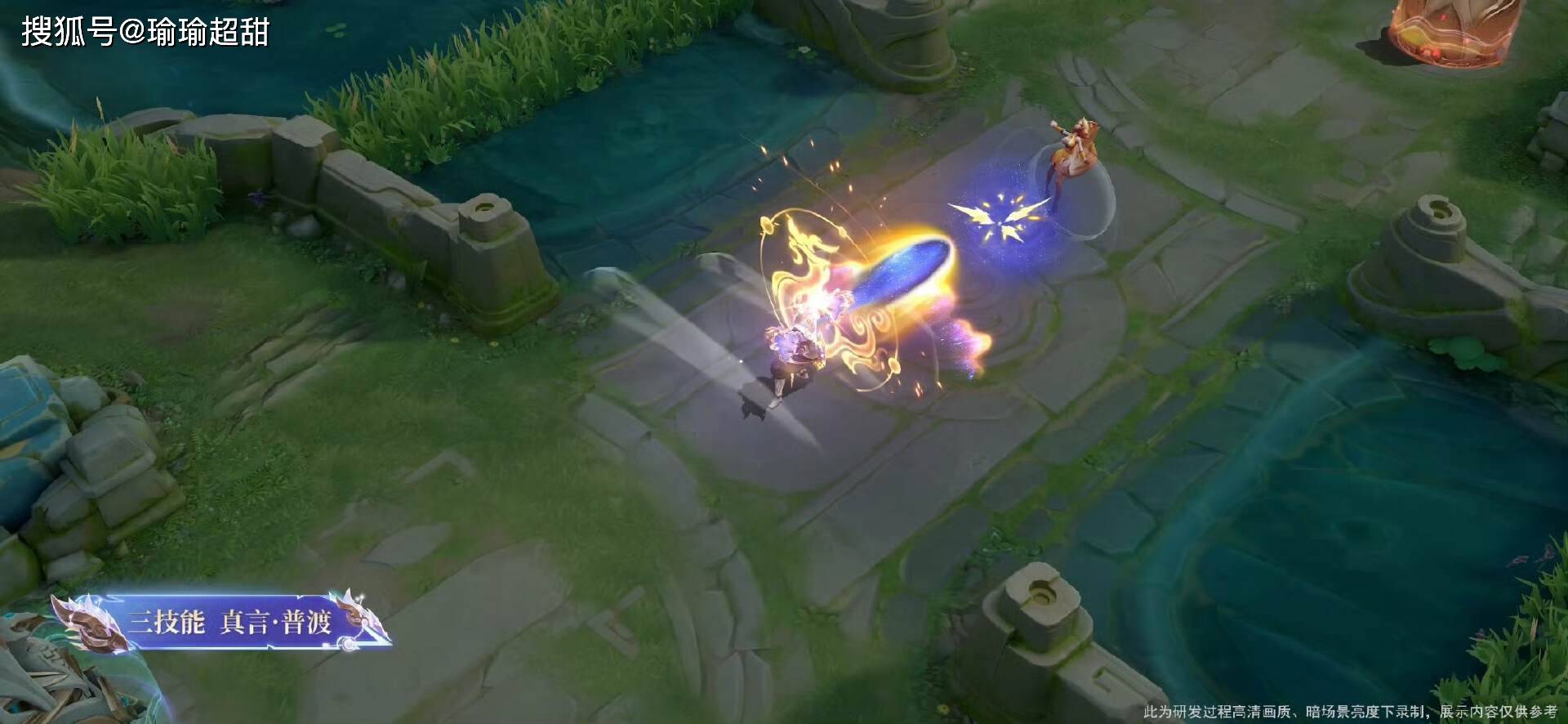 第二段是位移技能,施法之后,会出现达摩的身影,后面会跟随影子特效,然后也会有一个拖尾特效,融入了二十八星宿相关的设定。