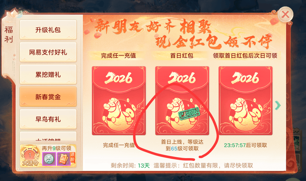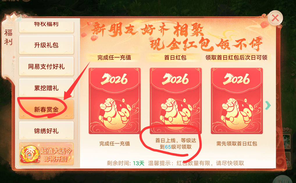 在新区首日等级达到65级之后,点击主页——左上角——福利——新春赏金,还真的可以领取到首日红包。游戏升级蛮快的,跟着主线剧情走,留意成长手册各项任务,就能快速达成目标了。
