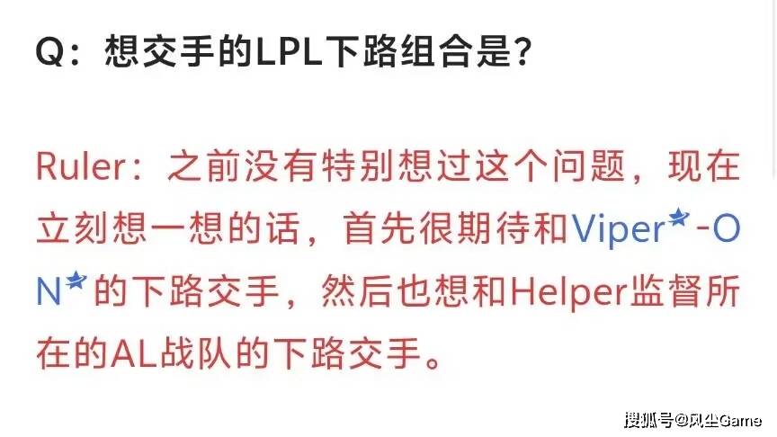 GEN在零封BFX,拿到联赛冠军之后,Gen全队,都接受了媒体专访,在采访里媒体提问:最想交手的下路组合是?尺帝当即回应:之前没有想过这个问题,现在立刻想一想的话,首先很期待BLG的双人组,然后也想和AL下路交手,看来之前网传说,BLG和GEN双人组特训,是真的啊。