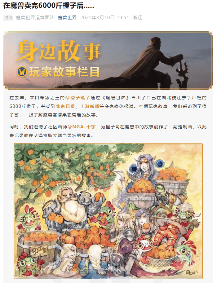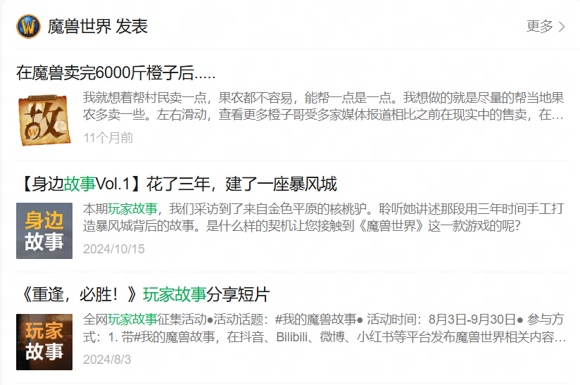 翻开魔兽世界的官方公众号,“身边故事”作为一个长期栏目持续更新。这也让官方的宣发阵地不再只是一块冰冷的版本公告板,而是一本充满温度的“玩家纪实录”。