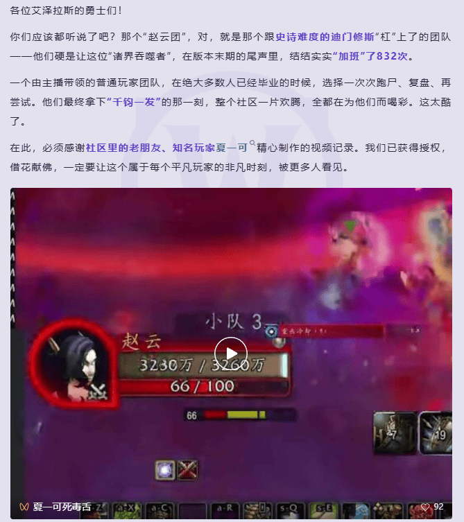 这种“反潮流”的创作态度,像极了当年那些在YY里喊破喉咙指挥的团长,他们并不计较什么“投入产出比”,只知道“真诚”才是艾泽拉斯通用的货币。可以说,这份认知源自游戏,却又超越了游戏,最终变成了一种刻进骨子里的身份认同。