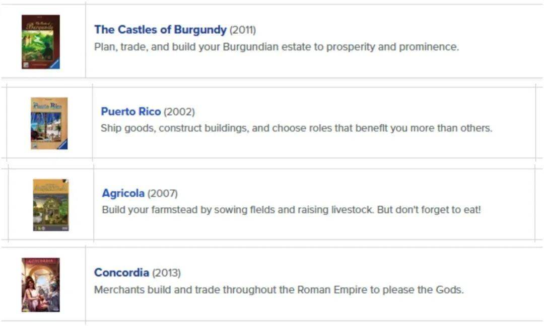 简单地说,就是这个游戏有着一定的“历史”,同时在此之前也能保证一个稳定的销量。之前三款作品的首发时间距今均在15年以上(《勃艮第城堡》2011年、《农场主》2007年),有些甚至已经超过20年(《波多黎各》2002年)。而《康考迪亚》发行时间为2013年,理论上也可以处于“长青“之列。