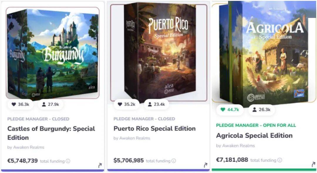 作为AR社目前的主打产品线之一,该系列在此之前已经完成了三款经典德式游戏的特别版众筹,并已完成了其中两款的发货。从成绩来看,三款游戏的成绩都已经不能仅仅用成功来形容,超百万不成问题,阻碍成绩的唯一因素只是可提供的内容还剩多少而已。