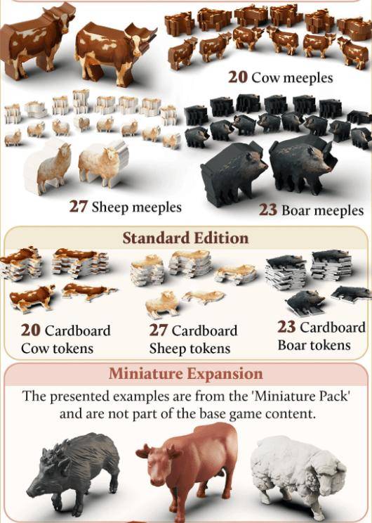 除了游戏本身的机制设计之外,这类游戏还需要有一定的配件数量基础,或是有可以升级替换的部分。最典型的应该是去年的《农场主》,虽然是一款卡牌游戏,但随着内容的增加,游戏中大量的token都被提供了更高级的方案,从纸板token、异形定制米宝再到模型,既可以满足不同玩家的喜好,也可以保证游戏最终的收藏价值,与目前常见的零售版本存在一定的差距。