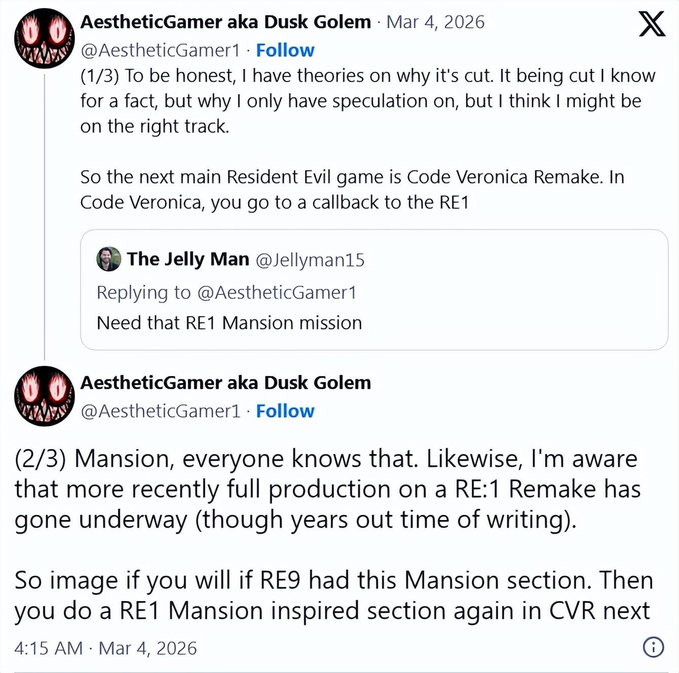 另外,据AestheticGamer透露,《生化危机:代号维罗妮卡》的重制版将是生化9之后的下一作,预计在2027年发售,而《生化危机0》的重制版预计在2028年发售,《生化危机10》目前计划在2029年。