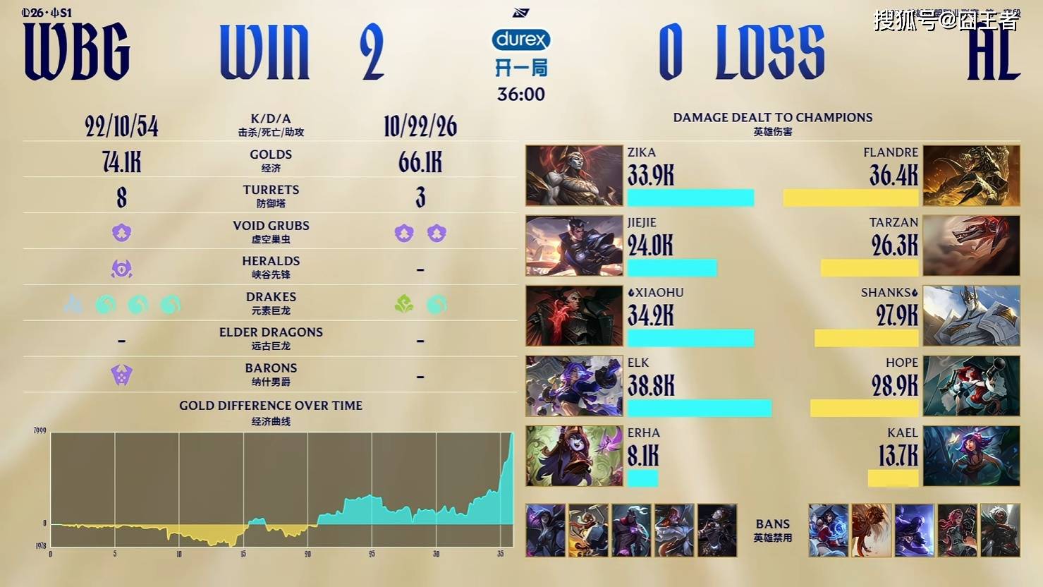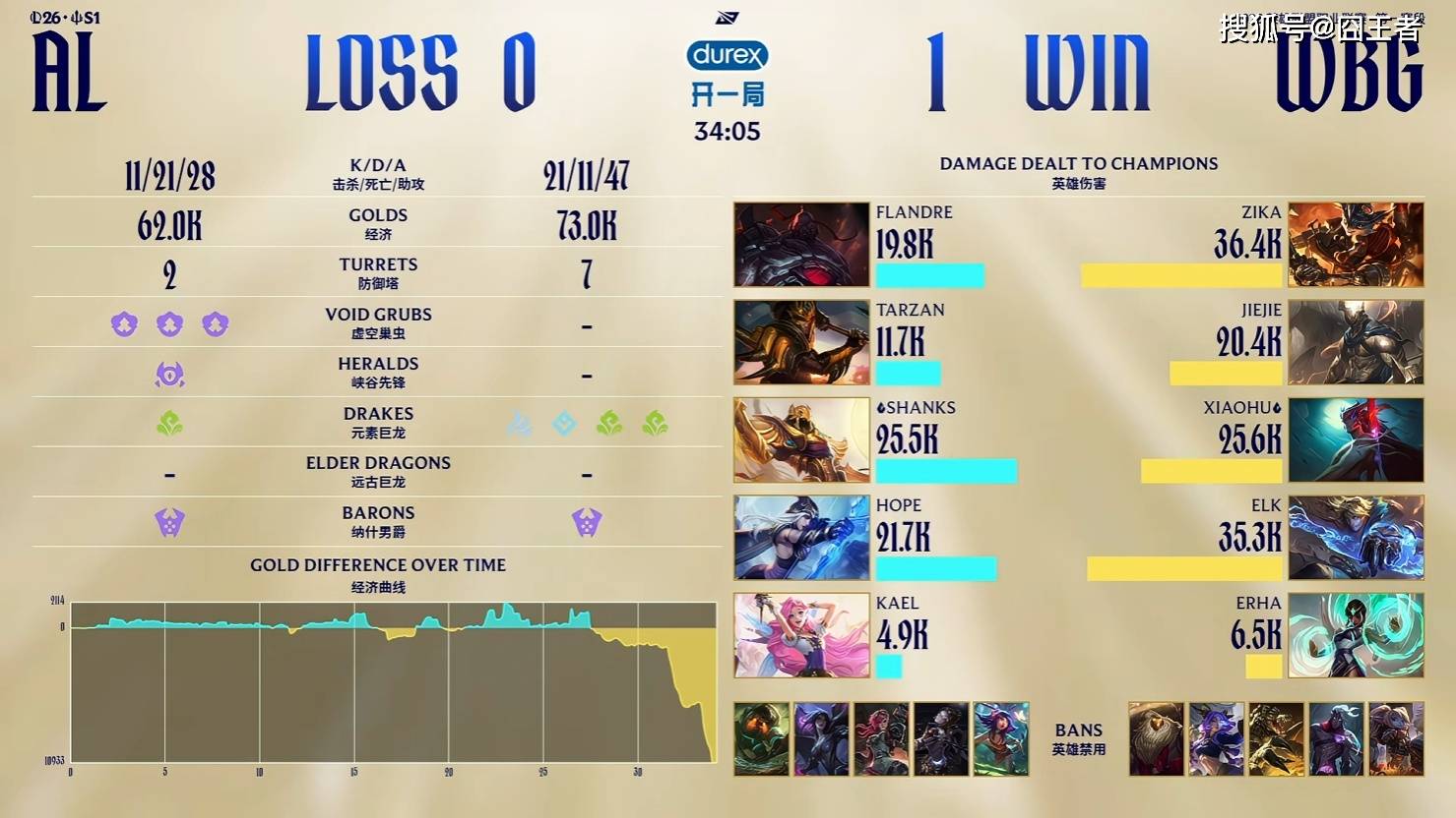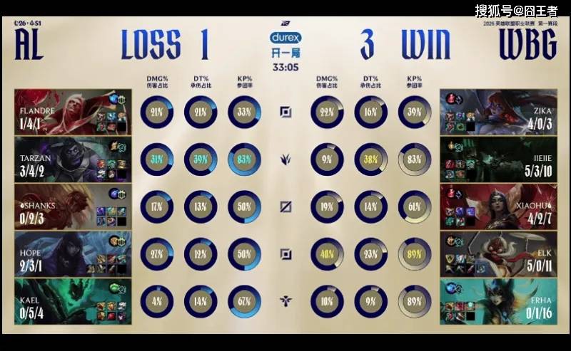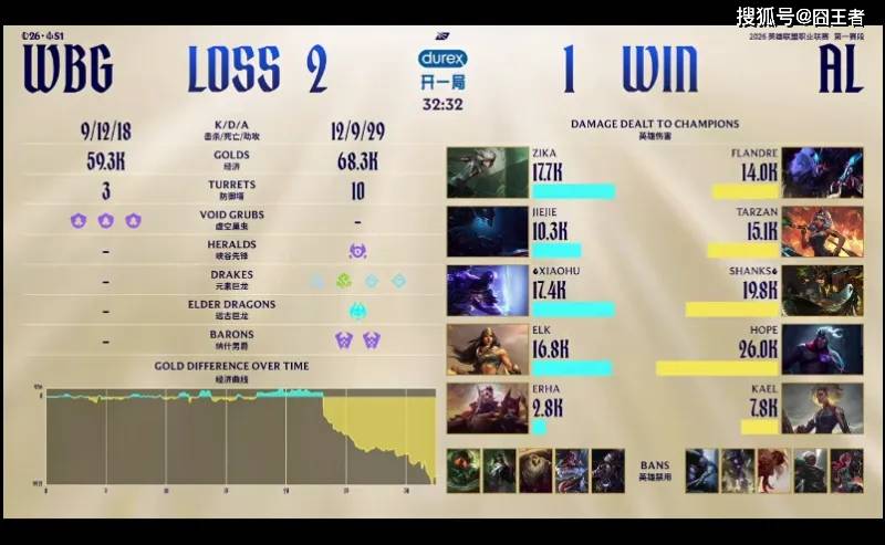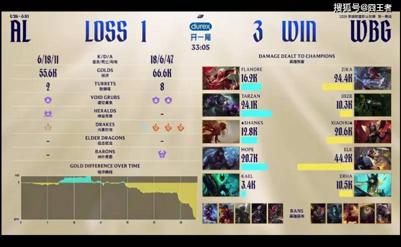结果第一局比赛,两队拼尽全力,经济几经波折,WBG笑到最后就。2分钟,皇子直接来下击杀扇子妈;6分钟,两边河道交锋,沙皇与兰博在野区阵亡;15分钟,WBG边线抓住机会,先后越掉沙皇、萨勒芬妮;21分钟,AL拿下小龙后WBG选择追击,但中野纷纷阵亡,后续AL拿下大龙;23分钟,AL拿下大龙后沙皇在边线阵亡;26分钟,小龙团再次交锋,AL打出2换3随后各自拉开;27分钟, WBG击杀AL下野,随后拿到小龙;31分钟,Jiejie突施冷箭抢龙成功,WBG团战大获全胜;最终34分05秒,WBG拿下龙魂随后顺利一波