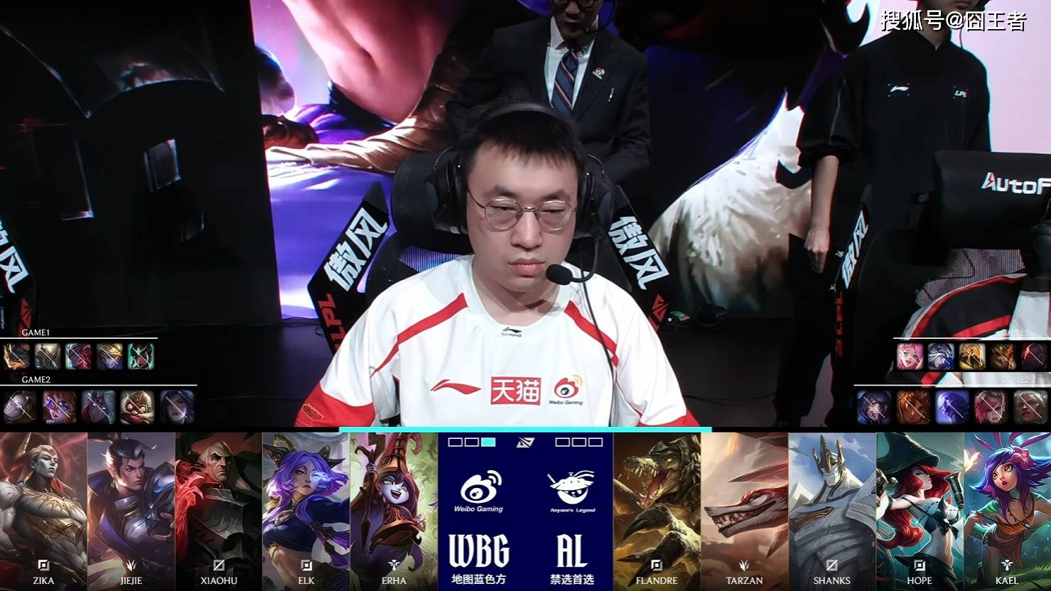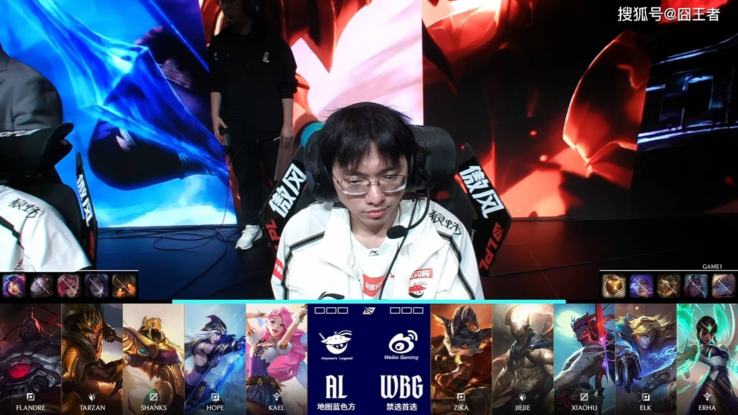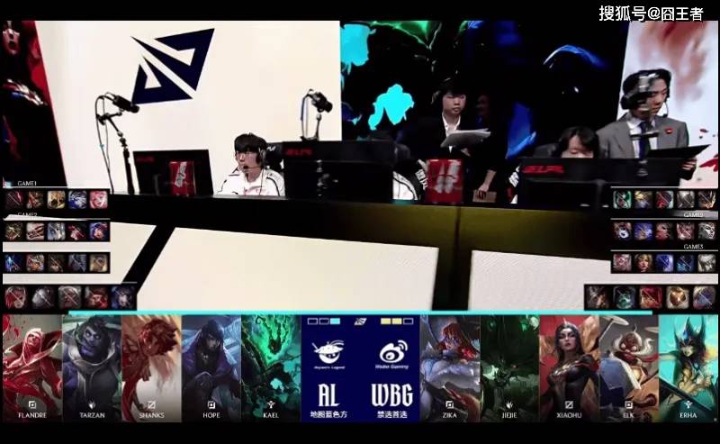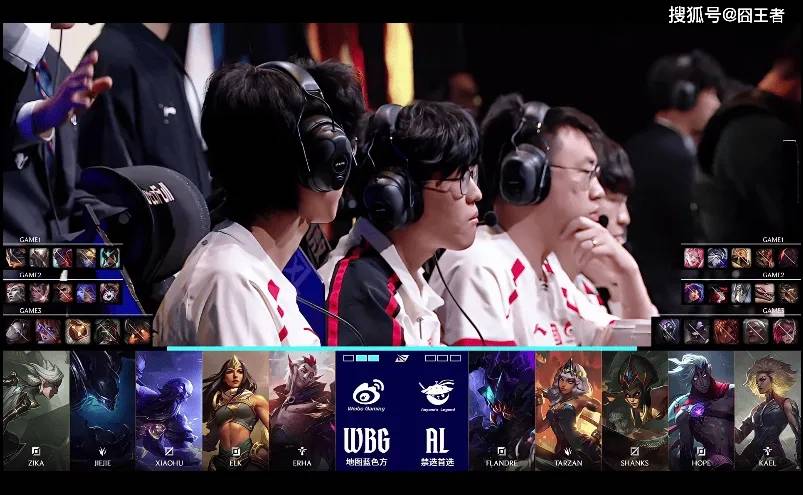 第一局比赛,AL红色方,禁用:妮蔻、发条、蔚、卡莎、泰坦,选用:Flandre塞恩、Tarzan皇子、Shanks沙皇、Hope寒冰、Kael歌姬;WBG红色方,禁用:波比、韦鲁斯、鳄鱼、芸阿娜、巴德,选用:Zika兰博、Jiejie潘森、Xioahu永恩、Elk EZ、Erha扇子妈
