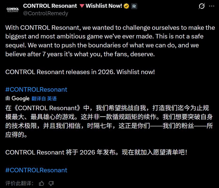 游戏预定于今年发售,距离2019年《控制》发售,现实时间跨度恰好也是7年。