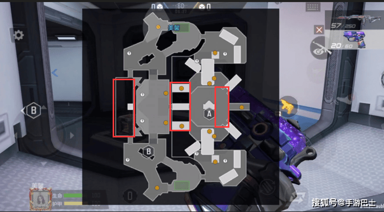 当然,该点位离B点也很近,只需要穿过蓝色的传送门即可。不过,B点位是双方交火比较集中的区域,周围很可能有对手蹲守。因此,如果有召唤笨笨技能,建议优先使用;如果没有,则在进入B点时需注意观察四周,可以使用球形护盾技能以减少受到的攻击伤害。