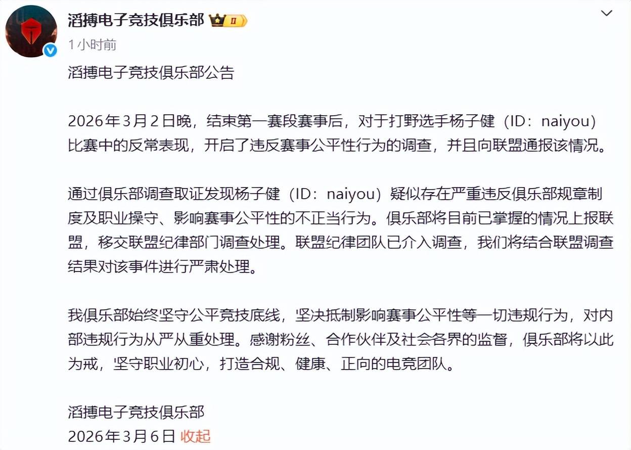 TES战队在2026年3月6日发布公告,宣布对打野选手naiyou展开假赛调查,这条公告让整个LPL赛区再次被推上风口浪尖。这起事件不仅暴露了LPL内部治理的深层危机,更与赛区整体衰落的轨迹形成残酷对照——曾经的"第一赛区"正以肉眼可见的速度滑向深渊。