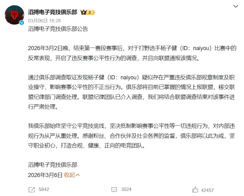 3月6日下午4点,滔博俱乐部官方宣布,打野选手Naiyou疑似存在严重违反俱乐部规章制度及影响赛事公平性的行为,几乎坐实了他参与假赛的情况。消息一经发布,迅速引发网友关注,大家普遍认为这与他此前0护甲蝎子的比赛表现有关。但出人意料的是,实际情况或许比我们想象的更为严重。