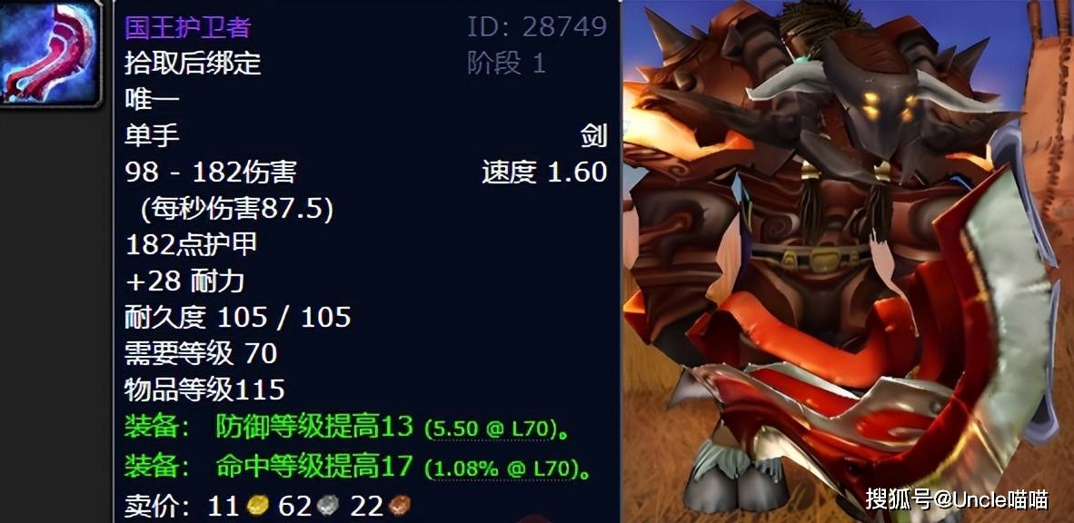 象棋的国王护卫者,喵叔是尤为推荐给脸黑的战士T大兄弟的,形同神兵一般的国王护卫者,同样是命中最优选的武器了,虽然数值低,但是贵在全面,虽然伤害没有潮汐之锤高,但是喵叔当年就是硬扛着国王护卫者直面伊利丹的,根本无压力,最重要的原因其实还是我脸太黑,残酷者和不败的意志都没拿到,只能硬着头皮用国王护卫者来美其名曰补命中,当然实践出真理,这把单手剑确实好用,喵叔100%推荐!