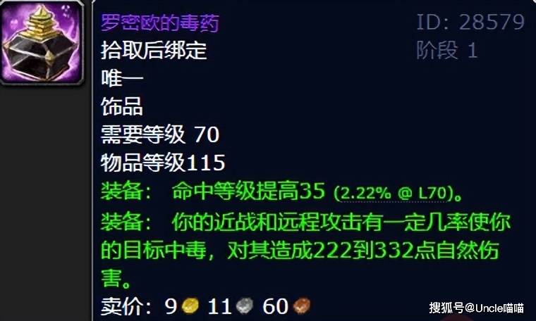 今日份最后的卡拉赞天花板级命中装,喵叔给到歌剧院的罗密欧毒药,这东西喵叔从始至终就推荐给两个职业,那就是战士和熊T,特别是战士T,在中后期命中还是非常紧张的,你到时候随身备着一个罗密欧毒药,就知道容错率有多高了,而且这东西基本上几百金币分分钟能拿下,输出一般来说真的不太会要,毕竟现在有龙脊奖章和嗜血胸针在,单纯补命中的饰品他们一般不会作为首选,所以战士T和熊T瞅准时机即可拿下,那么最后的灵魂拷问给到各位大兄弟,以上卡拉赞性价比最高的5大命中装,你现在拿到了哪一款呢?我们评论区见!