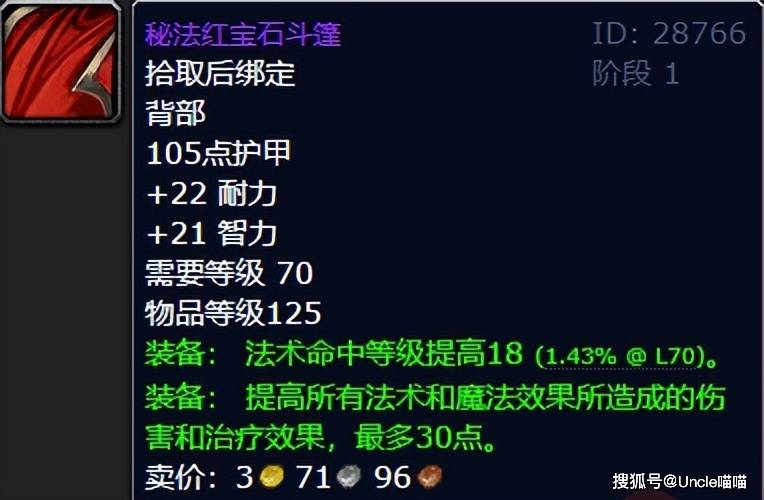第二席位就是当年TBC时期喵叔小法师挚爱的秘法红宝石斗篷了,同样是王子掉落,这款披风喵叔是推荐各位法系DPS作为常驻补命中的最佳披风,基于命中这一属性考量,你完全有理由用到海加尔山换小怪披风,特别是啃排骨的大兄弟,两者衔接好了性价比拉满直接恐怖如斯直戳天花板,而且红宝石斗篷属性和法伤都不低,无论初期炸裂还是说中后期吃排骨,他都是能堪大任!