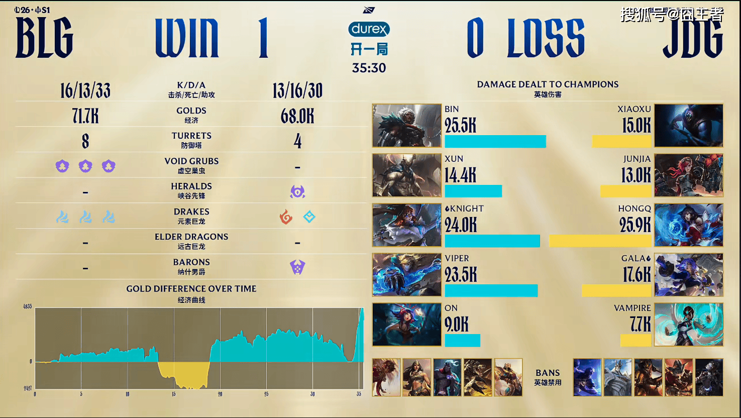 结果第一局比赛,JDG放弃了唯一一次反败为胜的机会,BLG笑到了最后。2分钟左右:HongQ阿狸e闪被左手躲掉,Xun潘森赶到闪现w收下一血;11分钟左右:JDG下路突然发难,蔚先手进场配合队友击杀辅助后追击收掉潘森打出一换二;12分钟左右:JDG抓住对方ad不在的空档直接开团击杀对方野辅,随后收掉赶来的EZ打出零换三;16分钟左右:ON妮蔻眼上蹲被JDG中野逮到,Xun潘森也被连累交出人头;19分钟左右:BLG进攻下路强杀武器后GALA芸阿娜滑脸ON妮蔻被控到瞬秒,BLG追击逐个击破打出零换五团灭;28分钟左右:Junjia入侵过深被Bin狼母逮捕,GALA也被ON妮蔻开到交出人头;最终35分30秒,BLG团灭JDG,先赢一局。