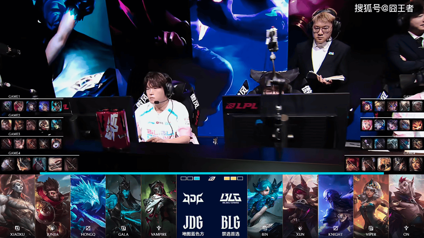 第四局比赛,JDG蓝色方,禁用:发条,兰博,韦鲁斯,纳亚菲利,石头人,选用:Xiaoxu亚恒,Junjia猴子,HongQ冰鸟,GALA滑板鞋,Vampire烈娜塔;BLG红色方,禁用:希维尔,卡牌,沙皇,奎桑提,安妮,选用:Bin格温,Xun奇亚娜,Knight瑞兹,Viper霞,ON洛