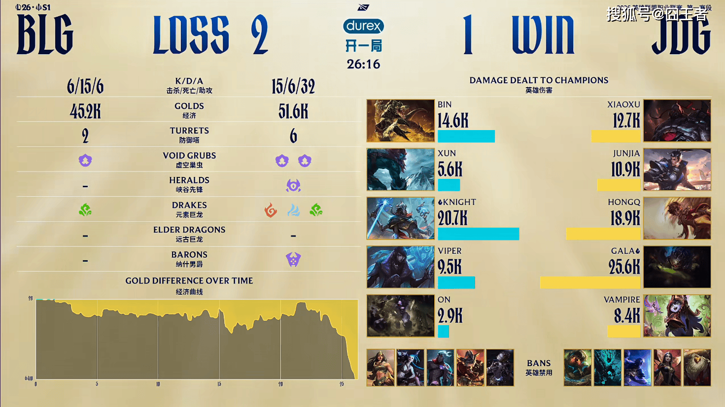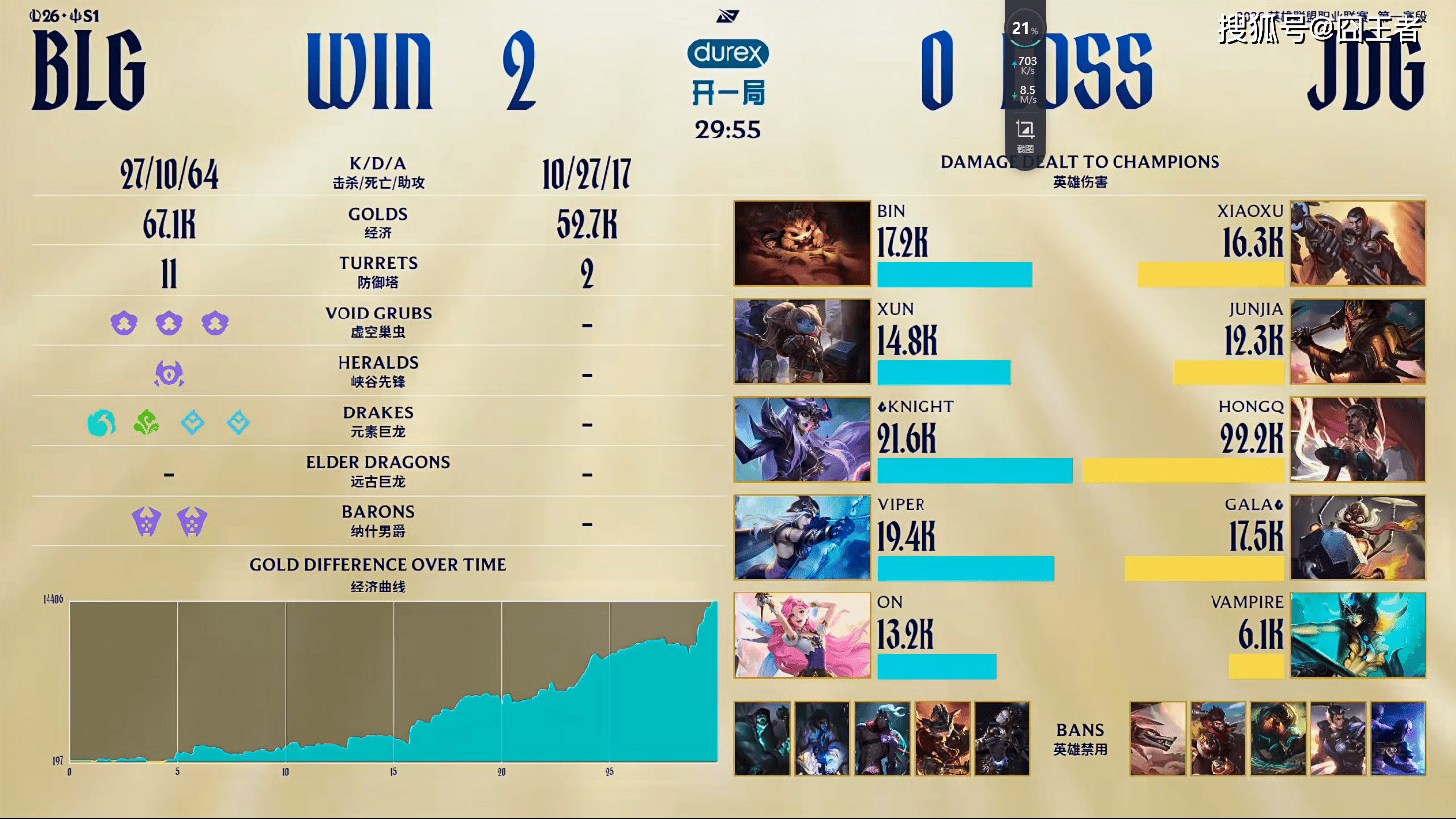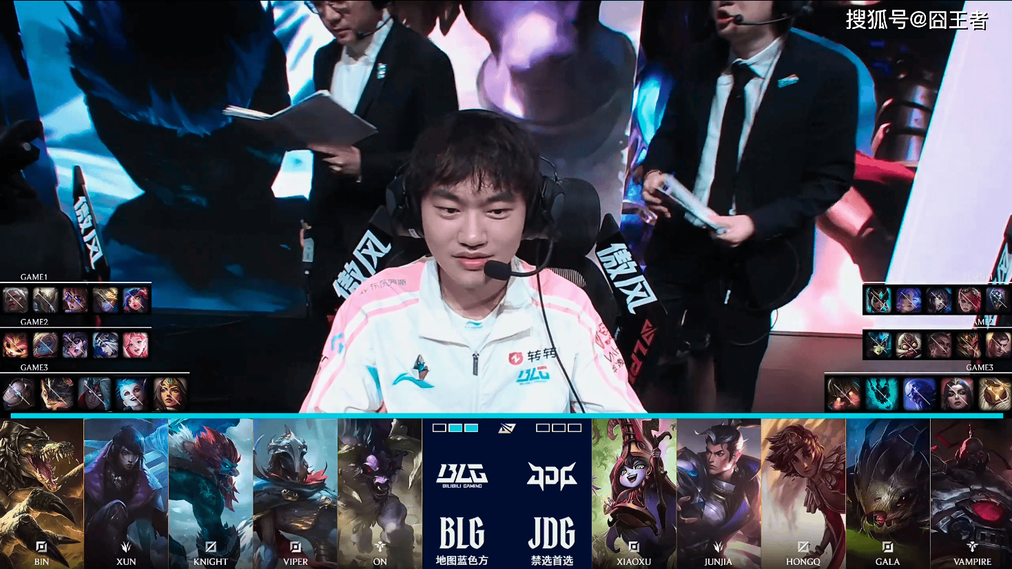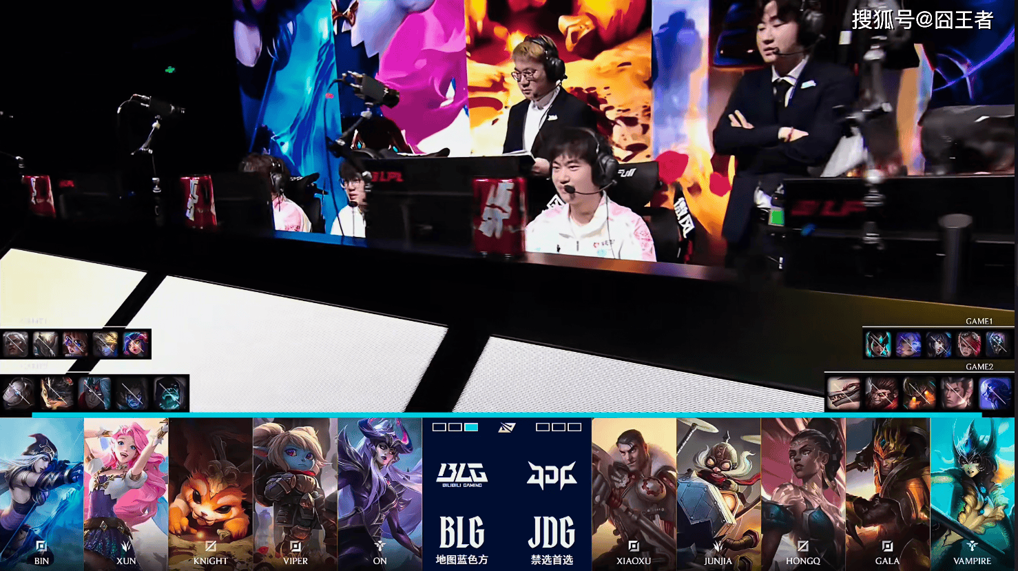 第一局比赛,BLG蓝色方,禁用:沙皇,鳄鱼,韦鲁斯,希维尔,岩雀,选用:Bin狼母,Xun潘森,Knight阿萝拉,ViperEZ,ON妮蔻;JDG红色方,禁用:发条,兰博,皇子,加里奥,瑞兹,选用:Xiaoxu武器,Junjia蔚,HongQ阿狸,GALA芸阿娜,Vampire卡尔玛
