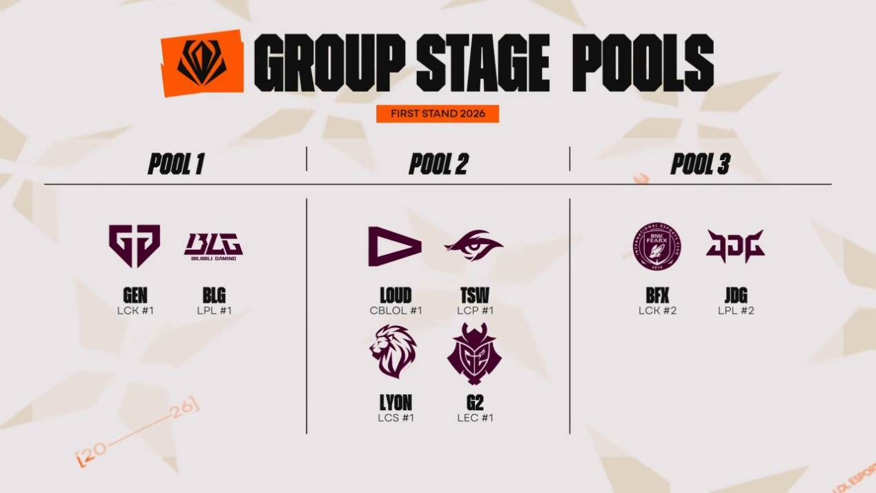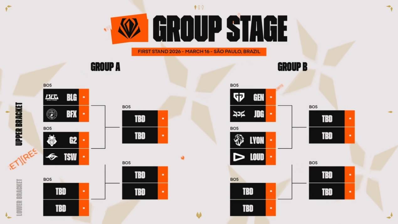 那么首轮的对阵在昨天BLG击败JDG之后就已经提前确定,BLG将会迎战BFX,而JDG则迎战GEN,BLG在A组,同组的两支队伍还有G2和TSW,B组另外一组是LYON对阵LOUD。